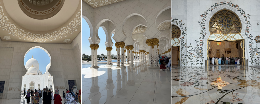 La Mezquita del jeque Zayed, una majestuosa simbiosis de arte y espiritualidad, apareció ante nuestros ojos blanca y resplandeciente bajo sol.