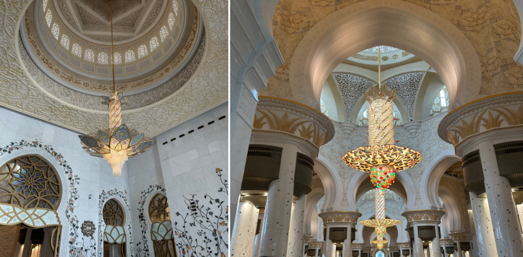 El interior de la mezquita está adornado con lámparas chapadas en oro y cristales de Swarovski que cuelgan elegantemente de sus cúpulas, y la mayor alfombra del mundo tejida a mano.