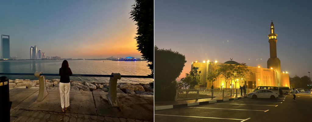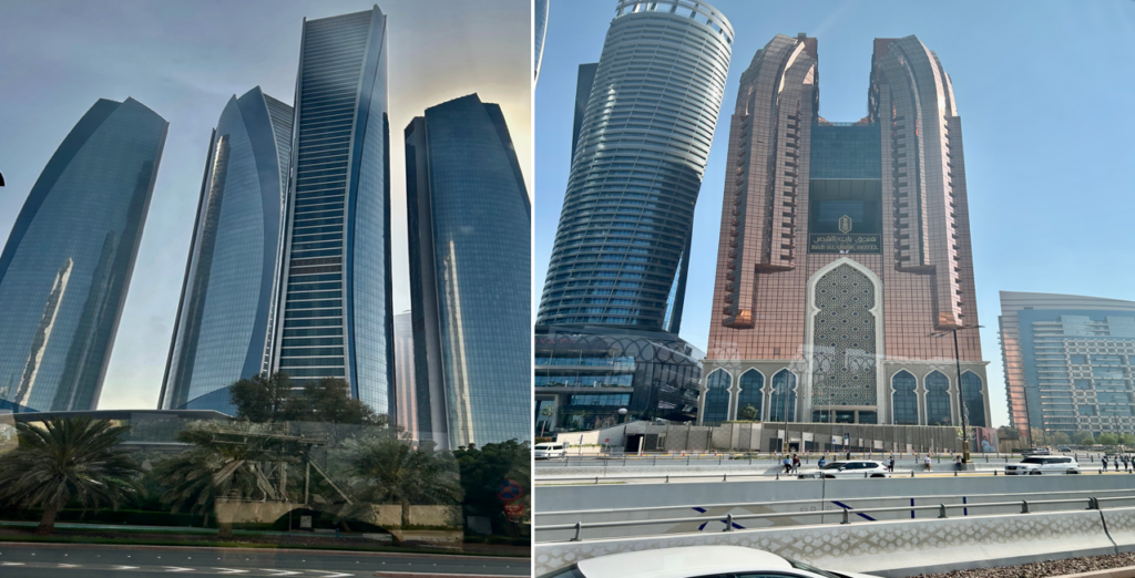 De vuelta al hotel paramos un momento para disfrutar de las vistas de la ciudad desde la Corniche. Espectaculares edificios como las icónicas Etihad Towers, el rascacielos ADNOC y el St Regis Abu Dhabi, destacaban en el horizonte bellamente iluminados.