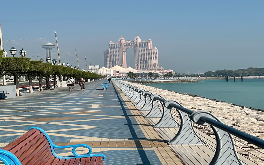 llegamos a la Corniche, un espectacular Paseo Marítimo en el centro de Abu Dhabi, con maravillosas vistas del skyline de la ciudad.