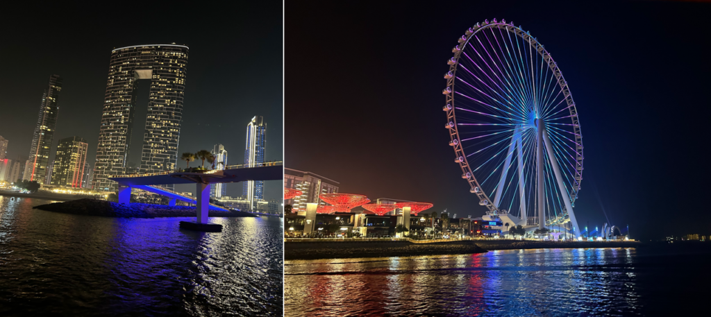 Quedamos maravillados con la vista de los fantásticos edificios iluminados y la Ain Dubái, la noria de observación más alta y grande del mundo, que cambiaba continuamente de color.
