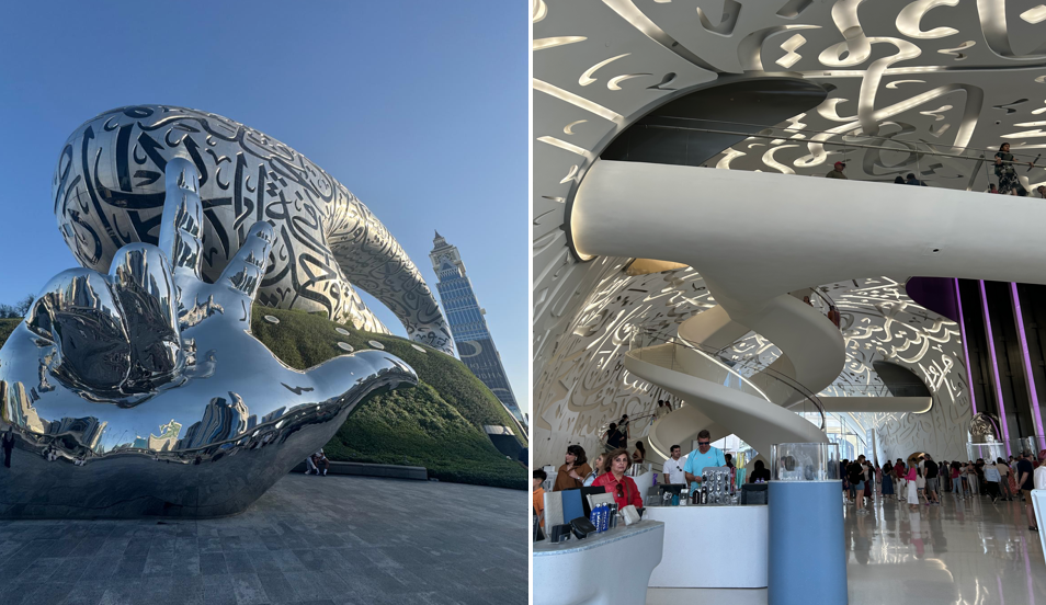 El impactante exterior del museo también destaca por el uso artístico de la caligrafía árabe, que a su vez hace de ventanas de cristal. Diseñadas por el artista emiratí Mattarbin Lahej, reflejan inspiradoras líneas poéticas escritas por su Alteza Sheikh Mohamed bin Rashid Al Maktoum, vicepresidente y primer ministro de los Emiratos Árabes Unidos, una de las frases dice ” El futuro pertenece a quienes pueden imaginarlo, diseñarlo y ejecutarlo”